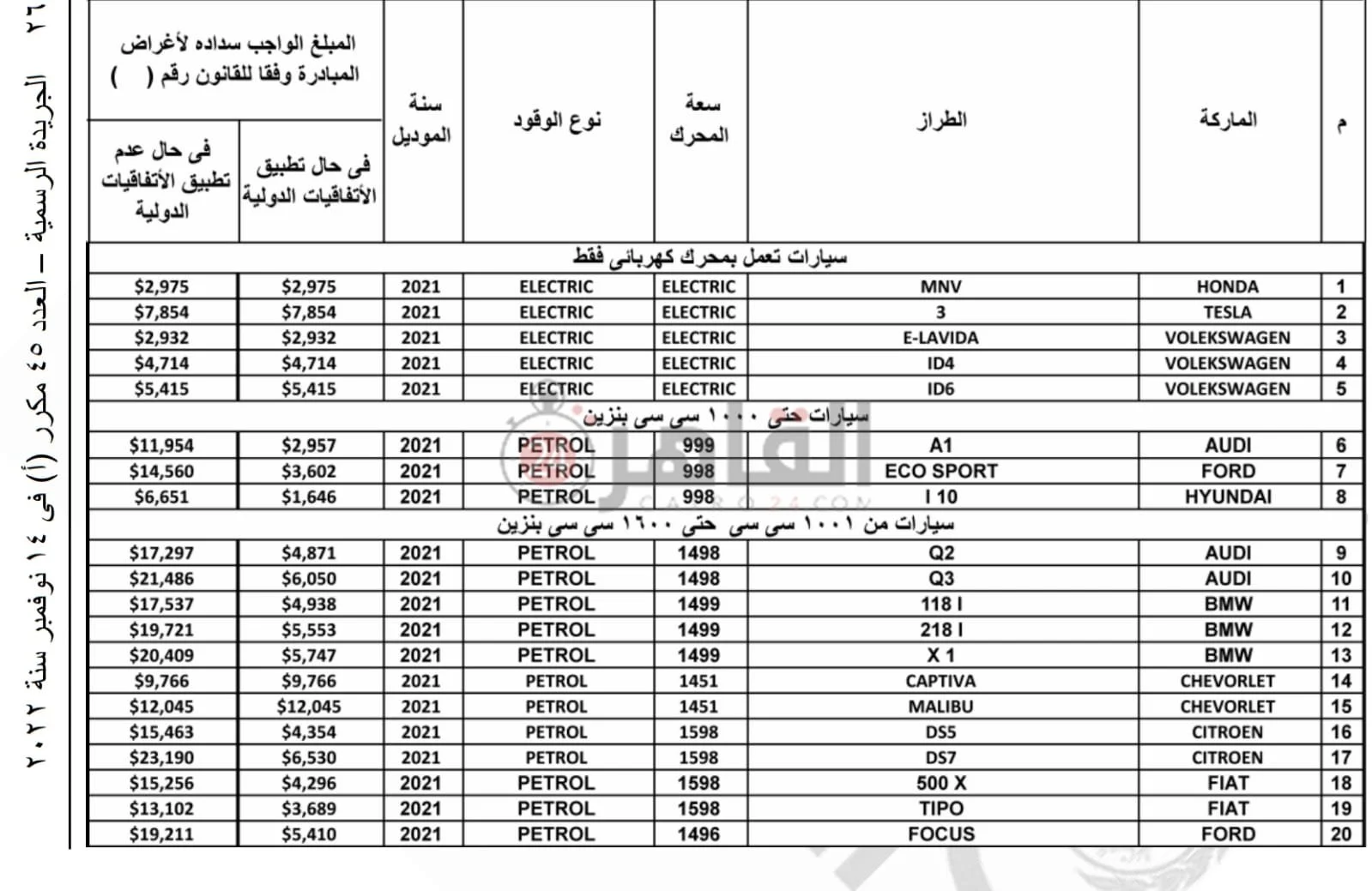 ويتم احتساب تكلفة استيراد سيارة من الخارج وفقًا للسعة اللترية الخاصة بسيارات البنزين، والتي تأتي على النحو التالي: