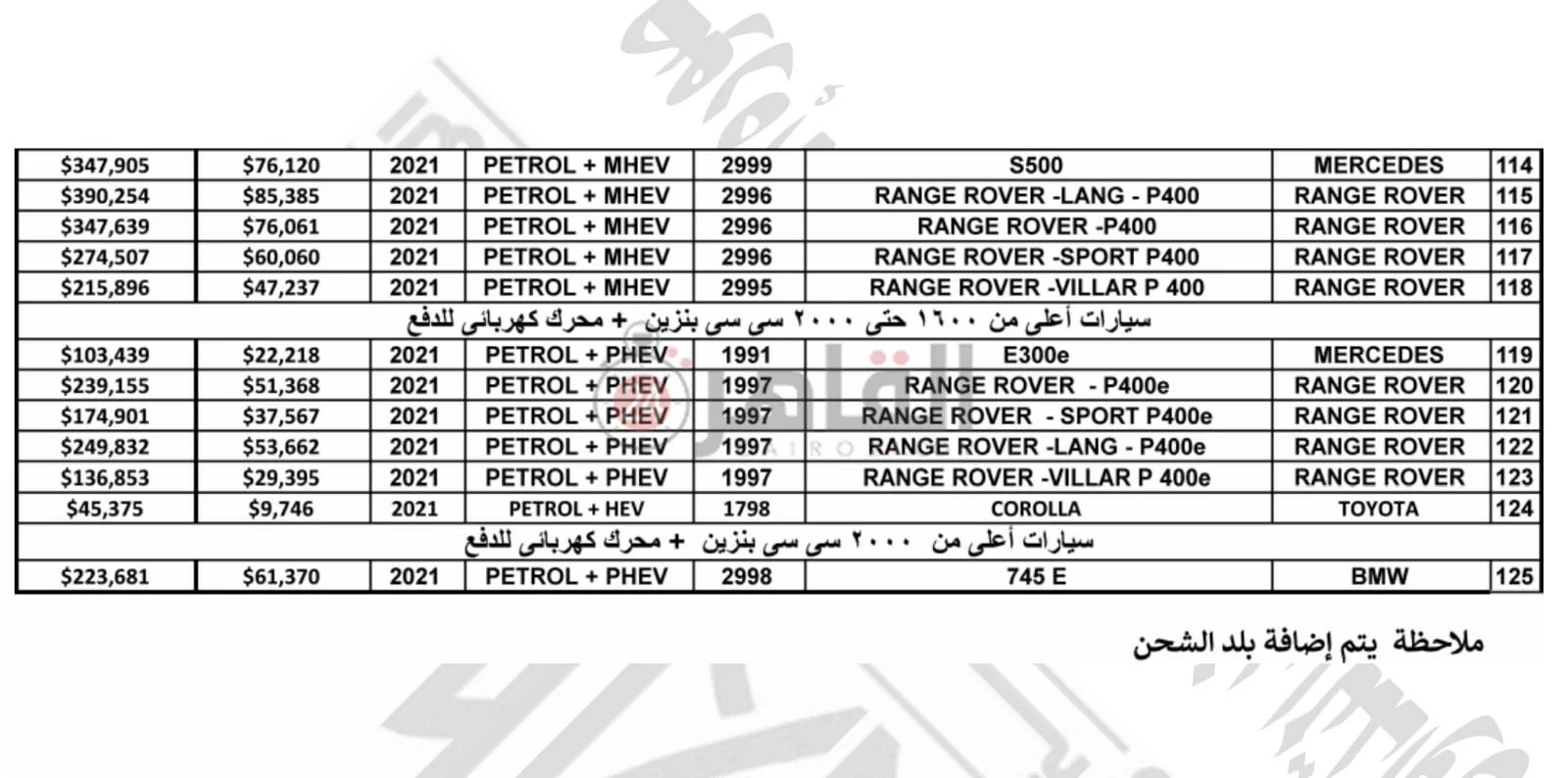 - والسيارات أعلى من سعة محرك 2000 سي سي تتراوح بين 135 ألف دولار وحتى نحو 900 ألف دولار.