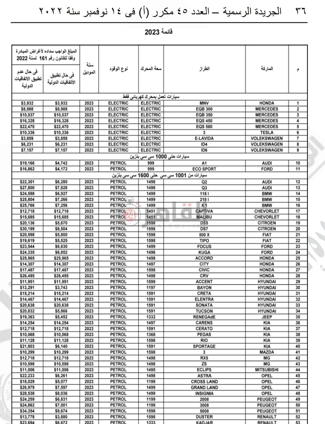 - والسيارات من 1601 سي سي وحتى 2000 سي سي فتتراوح بين 45 ألف دولار وحتى 130 ألف دولار.