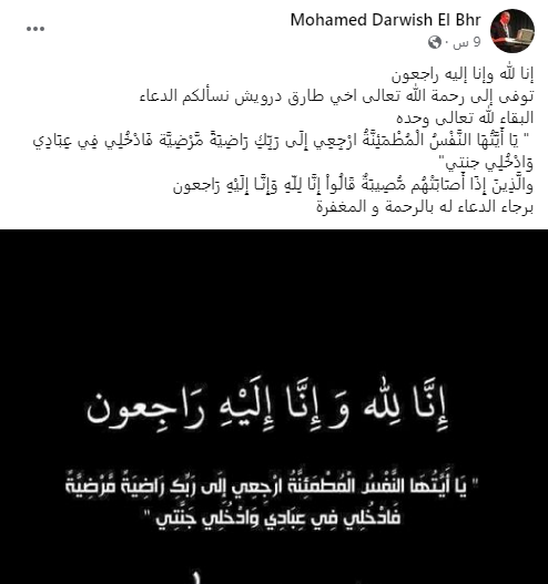 وكتب محمد درويش: إنا لله وإنا إليه راجعون، توفي إلى رحمة الله تعالى أخي طارق درويش نسألكم الدعاء، البقاء لله تعالى وحده يَا أَيَّتُهَا النَّفْسُ الْمُطْمَئِنَّةُ ارْجِعِي إِلَى رَبِّكِ رَاضِيَةً مَّرْضِيَّة فَادْخُلِي فِي عِبَادِي وَادْخُلِي جنتي" والَّذِينَ إِذَا أَصَابَتْهُم مُّصِيبَةٌ قَالُواْ إِنَّا لِلّهِ وَإِنَّـا إِلَيْهِ رَاجعون برجاء الدعاء له بالرحمة والمغفرة.