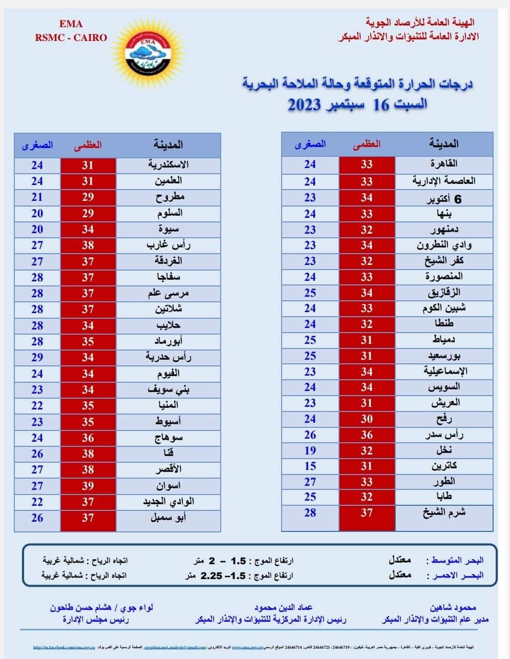 درجات الحرارة المتوقعة غدًا السبت 16 سبتمبر