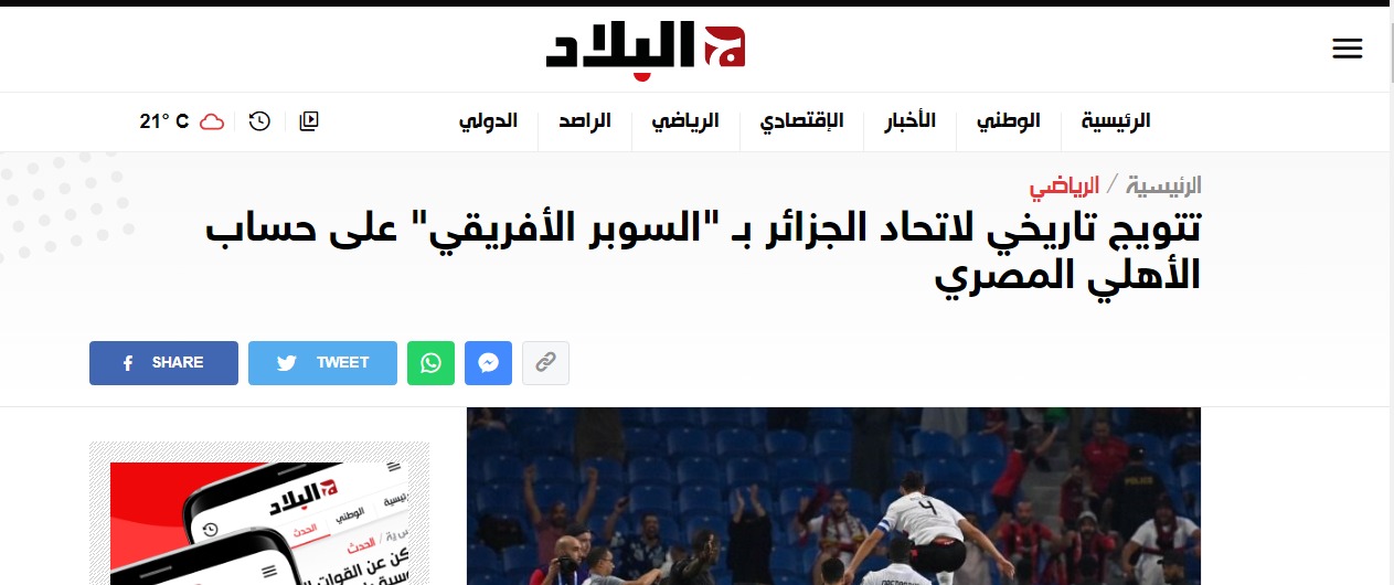 عنونت صحيفة البلاد اليوم السبت عن مباراة السوبر الإفريقي بـ تتويج تاريخي لاتحاد الجزائر بـ "السوبر الأفريقي" على حساب الأهلي المصري.