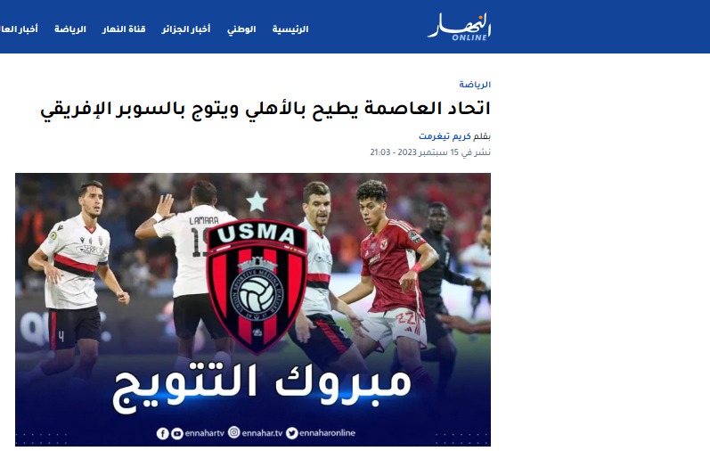 عنونت صحيفة النهار الجزائرية في تقريرها عن المباراة بـ اتحاد العاصمة يطيح بالأهلي ويتوج بالسوبر الإفريقي.
