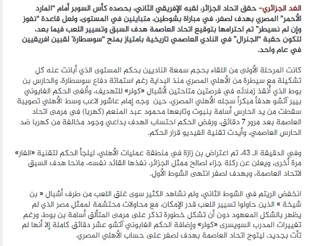 كما قالت الصحيفة في تقريرها عن المباراة، أن اتحاد العاصمة أصبح ثاني نادي جزائري ينتزع لقب السوبر الأفريقي من الأهلي المصري، وذلك بعد تتويج وفاق سطيف على حساب الأحمر باللقب ذاته في عام 2015.