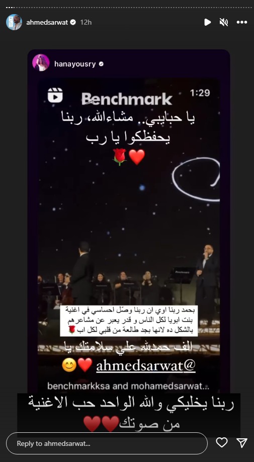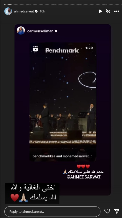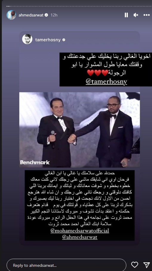بينما كتب الفنان تامر حسني عبر خاصية ستوري لحسابه الرسمي على انستجرام، الآتي: حمدلله على سلامتك يا غالي يا ابن الغالي فرحان أوي إني شايفك ماشي على رجلك لأني كنت معاك خطوة بخطوة وشوفت معاناتك وثباتك وإيمانك بربنا اللي كافأك دلوقتي ورجعك تاني على رجلك وإن شاء الله هترجع أحسن من الأول لأنك نجحت في اختبار ربنا ليك بصبرك وبشكرك لربنا على كل عطاياه وقولتلك في يوم قدام هتعرف حكمته، وأعتقد بدأت تشوف ومبروك لأستاذنا النجم الكبير محمد ثروت على نجاحه في هذا الحفل الرائع ومبروك عودة سلامة ابنك الغالي أحمد محمد ثروت.