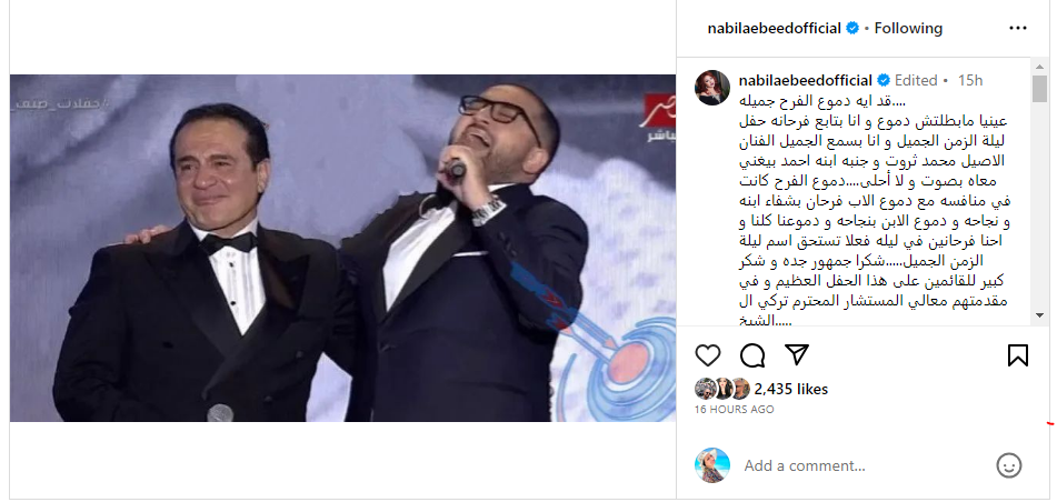 وكتبت نبيلة عبيد لـ أحمد ثروت عبر حسابها على انستجرام: قد غيه دموع الفرح جميلة.. عينيا مابطتش دموع وأنا بتابع فرحانة حفل ليلة الزمن الجميل وأنا بسمع الجميل الفنان الأصيل محمد ثروت وجنبه ابنه أحمد بيغني معاه بصوت ولا أحلى.. دموع الفرح كانت في منافسة مع دموع الأب فرحان بشفاء ابنه ونجاحه ودموع الابن بنجاحه ودموعنا كلنا واحنا فرحانين في ليلة فعلًا تستحق اسم ليلة الزمن الجميل.. شكرًا جمهور جدة وشكر كبير للقائمين على هذا الحفل العظيم وفي مقدمتهم معالي المستشار المحترم تركي آل الشيخ.