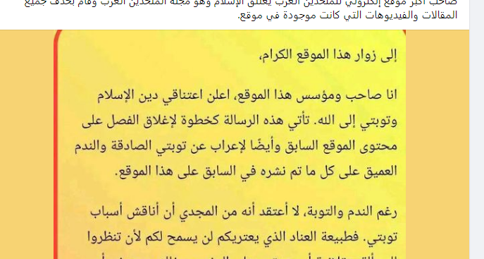 وكشف صاحب موقع الملحدين العرب عن إسلامه في بيان عبر الموقع قائلًا: أنا صاحب ومؤسس هذا الموقع، أعلن اعتناقي دين الإسلام وتوبتي إلى الله. تأتي هذه الرسالة كخطوة لإغلاق الفصل على محتوى الموقع السابق وأيضًا للإعراب عن توبتي الصادقة والندم العميق على كل ما تم نشرته في السابق على هذا الموقع.
