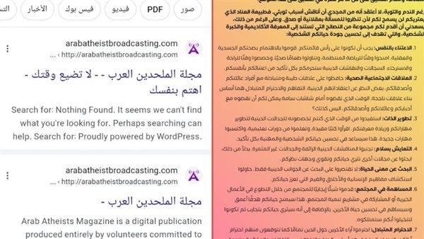 بينما قال آخر، صاحب ومؤسس مجلة الملحدين العرب، أعلن توبته وعودته إلى الإسلام، وحذف جميع المقالات والفيديوهات التي كانت موجودة في موقعه.