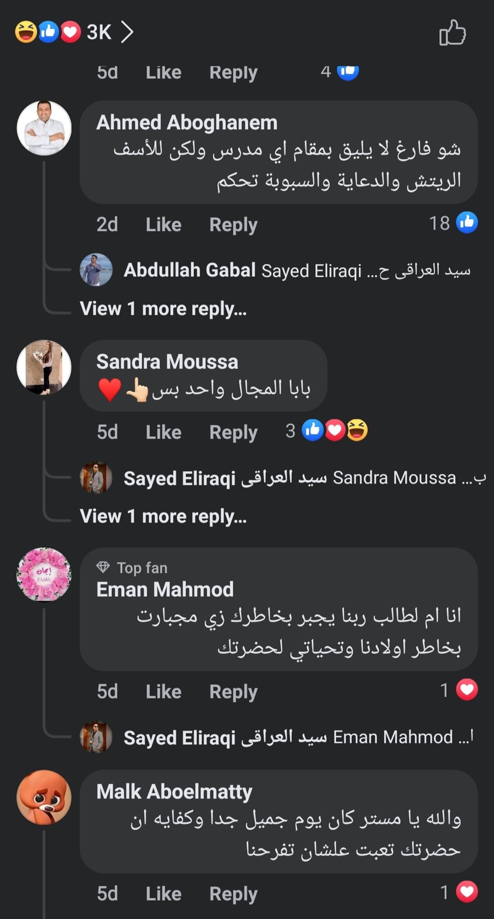 بينما وجهت ساندرا موسى رسالة للمدرس خلال تعليقها على الفيديو: حبيبي يا مستر محدش هينسي تعبك طول السنة.. من أكتر المدرسين المحترمين وأغلاهم على قلبي، مكنتش مجرد مدرس بل أب وأخ كبير، بالتوفيق دايمًا.. ومن ارتفاع لـ ارتفاع.