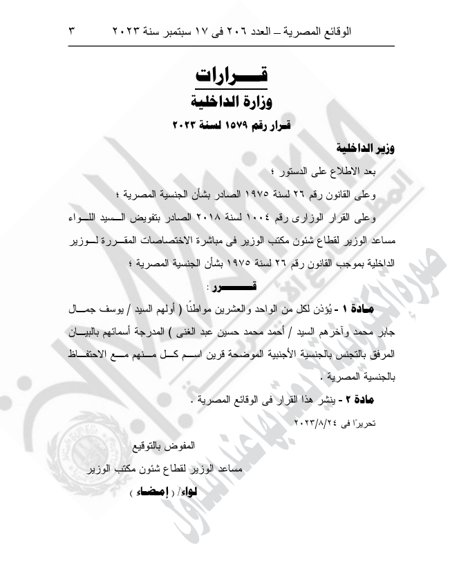 نشرت الجريدة الرسمية قرار اللواء محمود توفيق وزارة الداخلية والذي يحمل رقم 1579 لسنة 2023، بشأن منح بعض الأشخاص الجنسية الأجنبية مع الاحتفاظ بالجنسية المصرية.