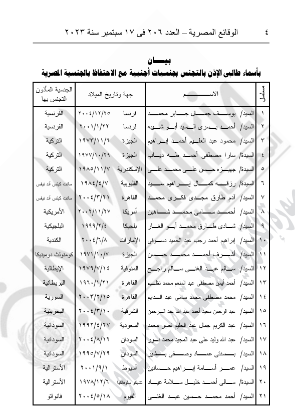 وفي سياق منفصل، كانت قد نشرت الجريدة الرسمية قرار اللواء محمود توفيق وزارة الداخلية والذي يحمل رقم 1182 لسنة 2023، بشأن منح بعض الأشخاص الجنسية الأجنبية مع الاحتفاظ بالجنسية المصرية.