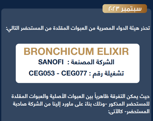 حذرت هيئة الدواء المصرية من عبوات مقلدة بالسوق المصري من دواء برونشيكم إلكسير، المستخدم تحت إشراف طبي في علاج أمراض الجهاز التنفسي.