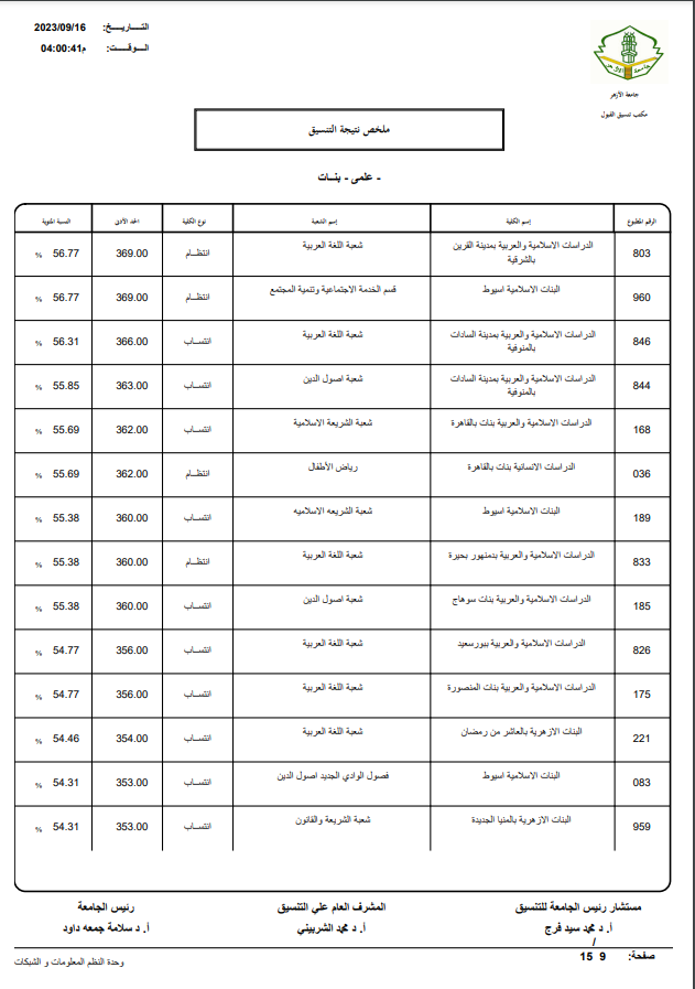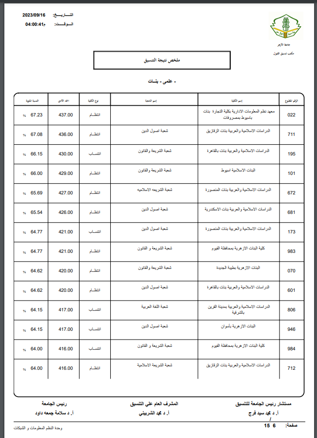 نتيجة تنسيق كليات الأزهر 2023 علمي بنات