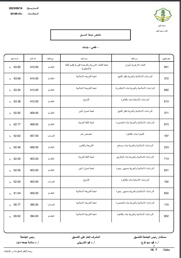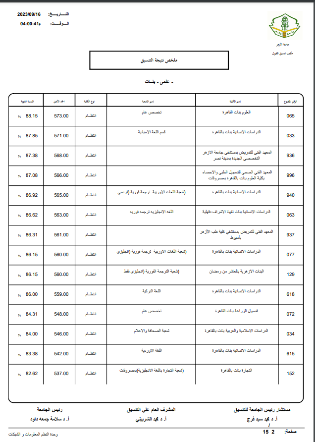 وجاء نتيجة تنسيق جامعات الأزهر 2023 علمي بنات كالتالي: