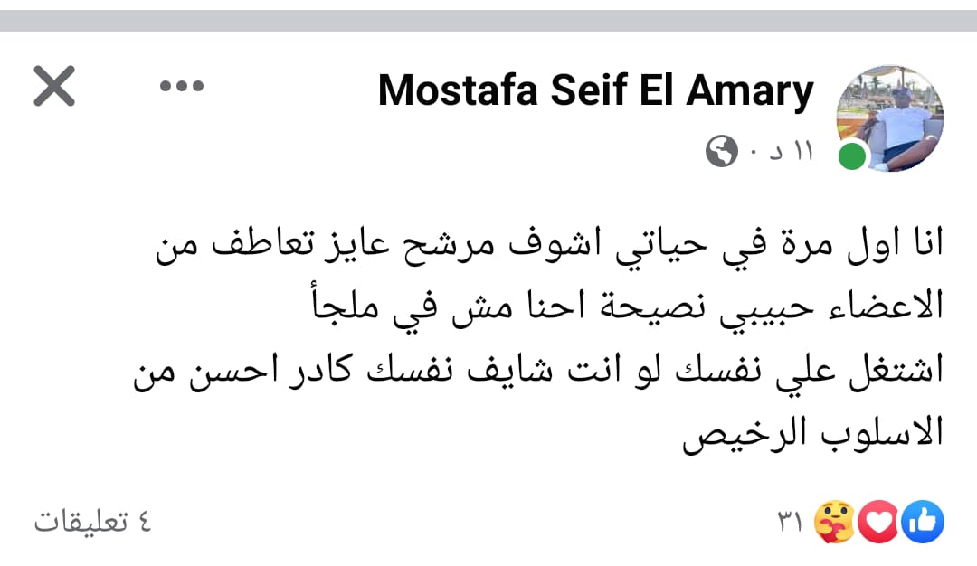 وقال العماري عبر صفحته الرسمية على فيسبوك: أنا أول مرة في حياتي أشوف مرشح عايز تعاطف من الأعضاء حبيبي نصيحة احنا مش في ملجأ، اشتغل علي نفسك لو أنت شايف نفسك كادر أحسن من الأسلوب الرخيص.