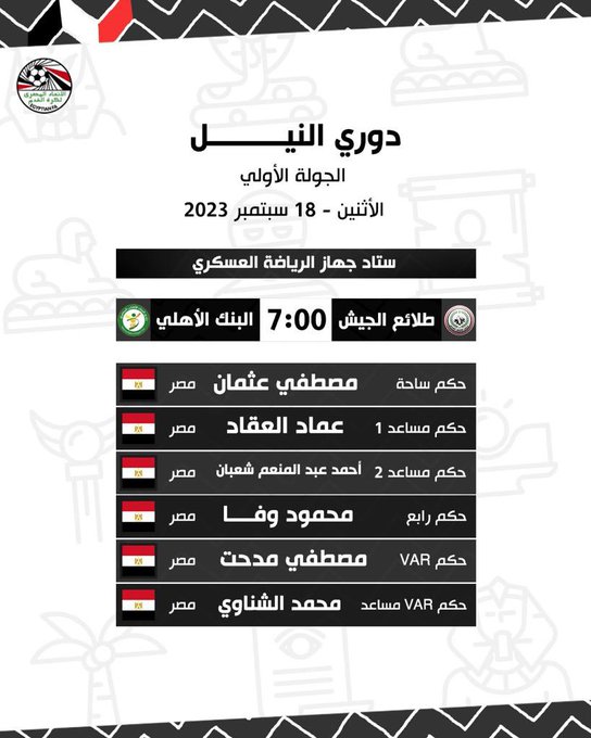 أعلن لجنة الحكام في الاتحاد المصري لكرة القدم، اليوم الأحد 17 سبتمبر 2023، طاقم حكام مباراة طلائع الجيش والبنك الأهلي في الدوري المصري الممتاز 2023-2024.