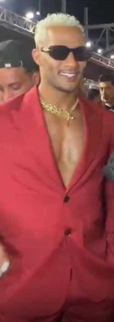 وظهر محمد رمضان بإطلالة مثيرة للجدل كعادته حيث ارتدى بدلة دون قميص باللون الأحمر، مع وضع سلسلة ذهب على شكل ثعبان، ما جعل الإعلامية بوسي شلبي تمازحه على إطلالته حيث قالت له على هامش الحفل: فين القميص يا رمضان؟، ليرد عليها الأخير: نسيته في مصر.