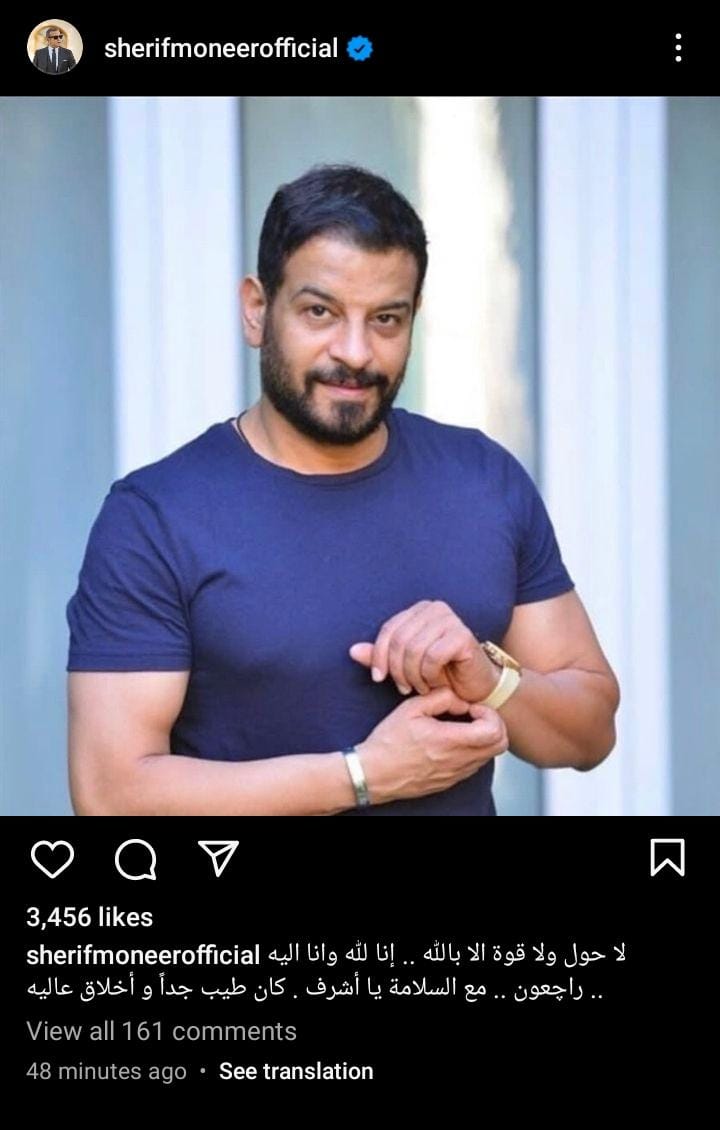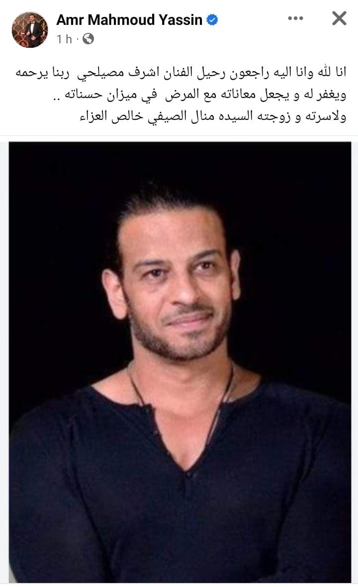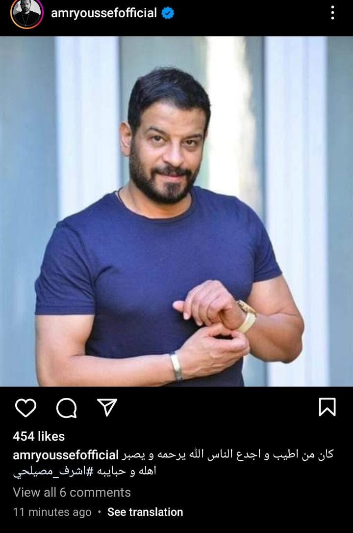 كما نشر الفنان عمرو يوسف، عبر حسابه الرسمي بموقع انستجرام، صورة للفنان اشرف مصيلحي، قال بها: كان من أطيب وأجدع الناس الله يرحمه ويصبر أهله وحبايبه.