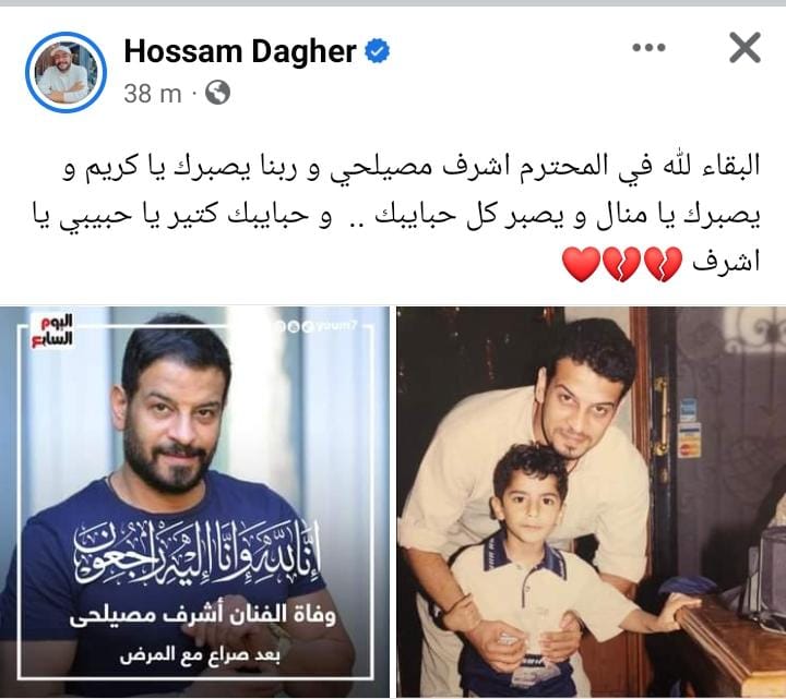 وأعرب الفنان حسام داغر، عن حزنه الشديد بخبر وفاة أشرف مصيلحي، وقال عبر حسابه الرسمي بموقع فيسبوك: البقاء لله في المحترم أشرف مصيلحي وربنا يصبرك يا كريم ويصبرك يا منال ويصبر كل حبايبك، وحبايبك كتير يا حبيبي يا أشرف.