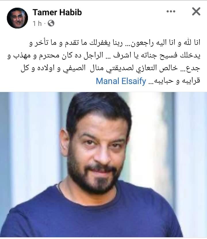 بالإضافة إلى السيناريست تامر حبيب، الذي كتب عبر حسابه الشخصي على موقع فيسبوك: إنا لله وإنا إليه راجعون، ربنا يغفرلك ما تقدم وما تأخر ويدخلك فسيح جناته يا أشرف، الراجل ده كان محترم ومهذب وجدع، خالص التعازي لصديقتي منال الصيفي وأولاده وكل قرايبه وحبايبه.