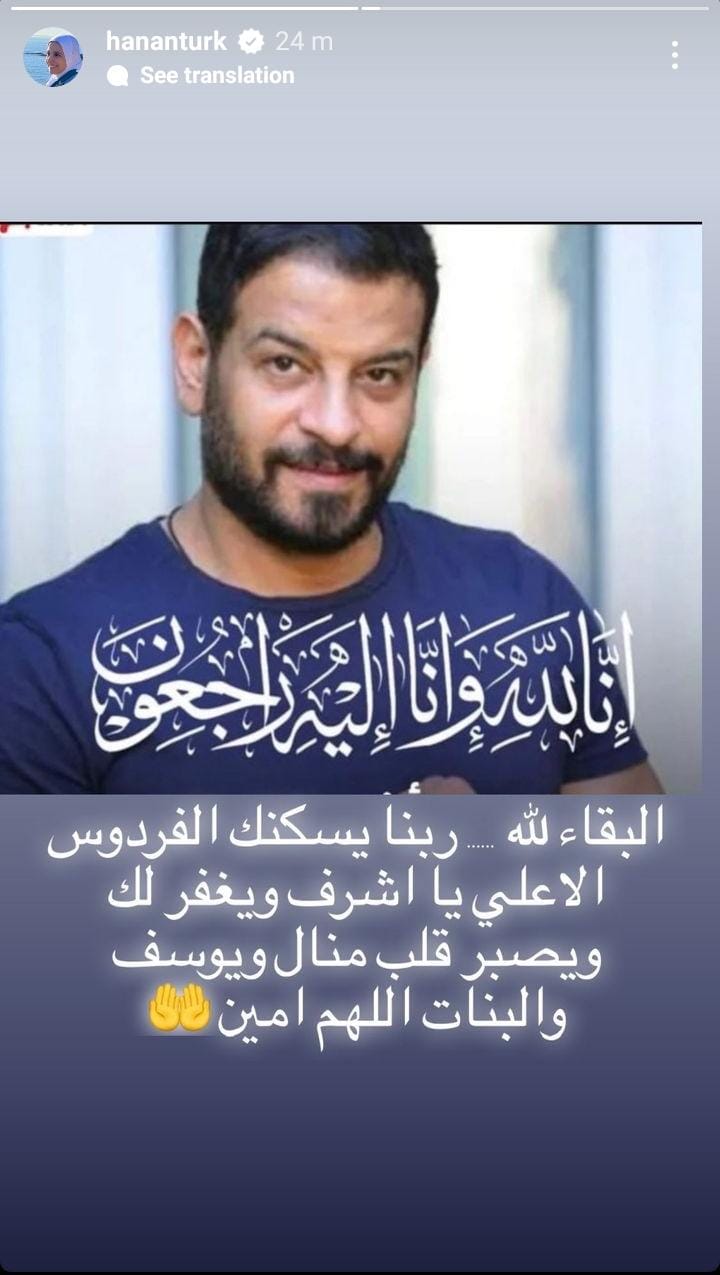 ونشرت الفنانة حنان ترك، ستوري عبر حسابها الرسمي بموقع انستجرام، نعت فيها أشرف مصيلحي، وقالت: البقاء لله، ربنا يرزقك الفردوس الأعلى يا أشرف ويغفر لك ويصبر قلب منال ويوسف والبنات اللهم أمين.