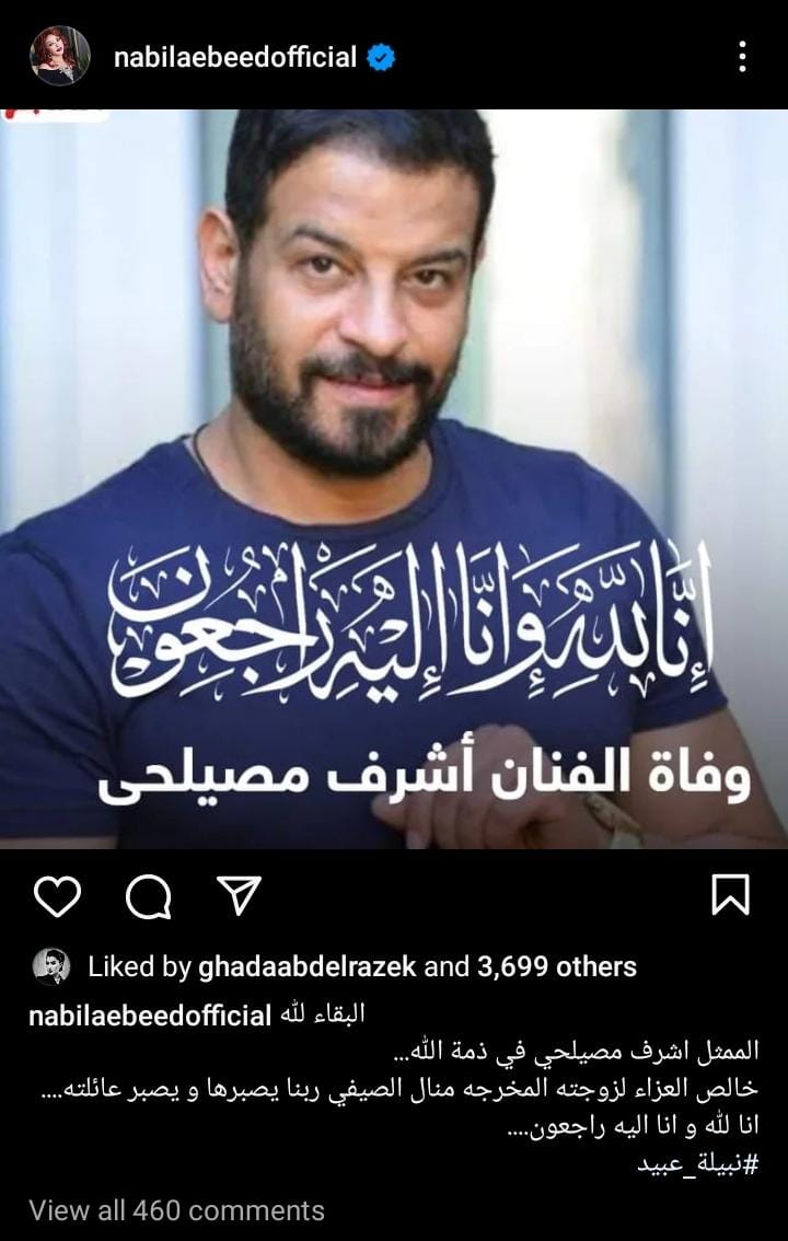 ونشرت نبيلة عبيد صورة لـ أشرف مصيلحي، نعته بها، عبر حسابها الرسمي بموقع انستجرام، وعلقت: البقاء لله، الممثل أشرف مصيلحي في ذمة الله، خالص العزاء لزوجته المخرجة منال الصيفي، ربنا يصبرها ويصبر عائلته، إنا لله وإنا إليه راجعون.