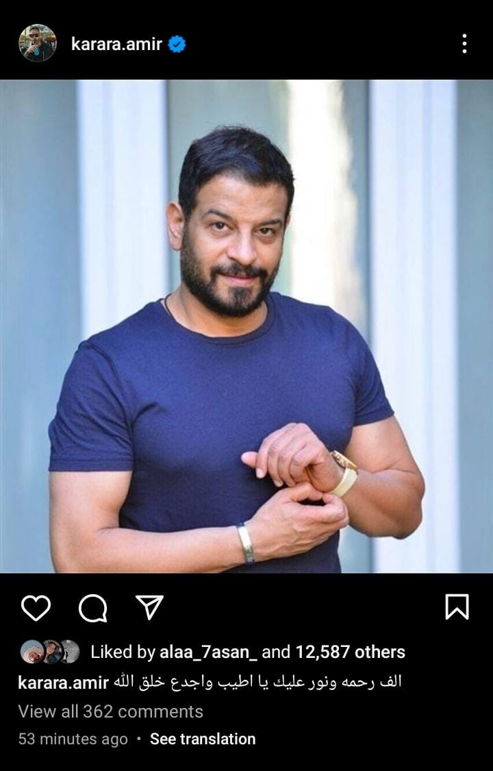 وكذلك الفنان أمير كرارة، الذي كتب على حسابه الرسمي بموقع انستجرام، ناعيًا أشرف مصيلحي: ألف رحمة ونور عليك يا أطيب وأجدع خلق الله.