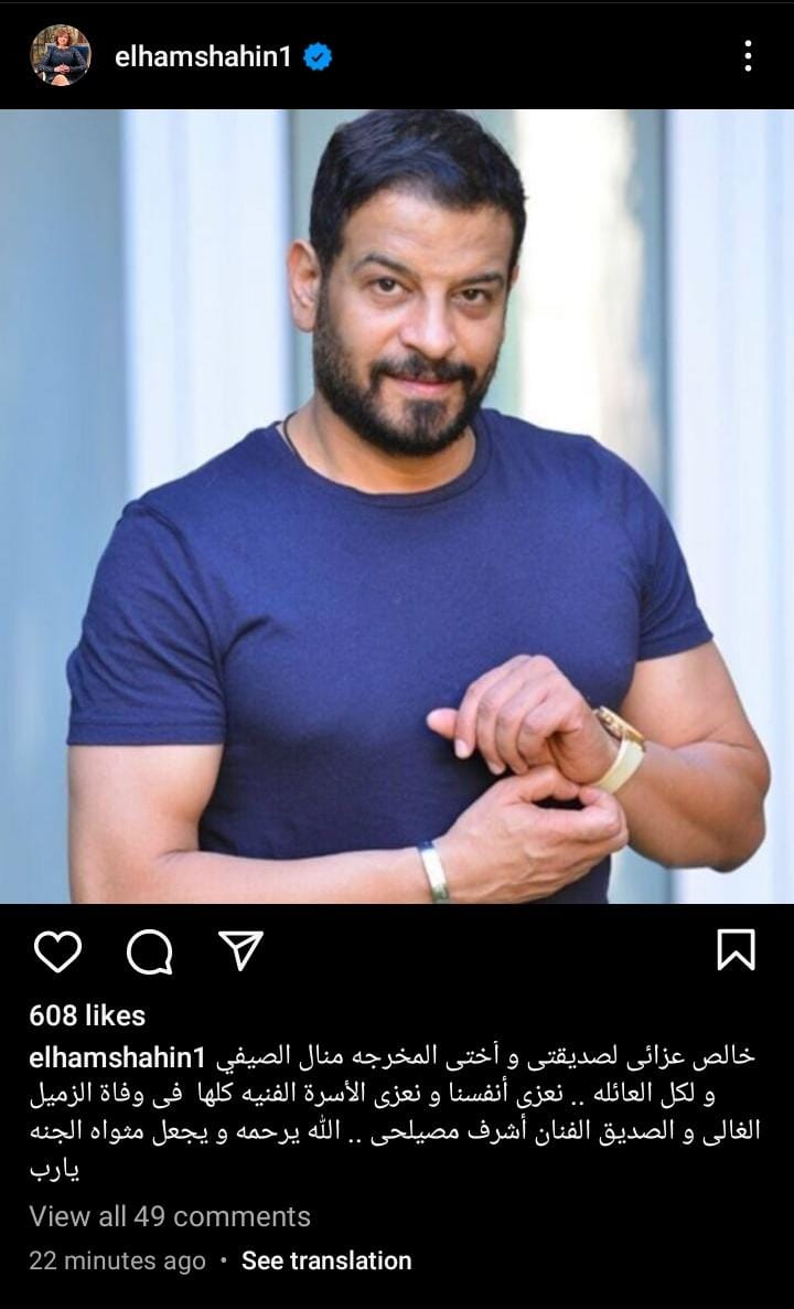 كما كتبت الفنانة إلهام شاهين، عبر حسابها الرسمي بموقع انستجرام: خالص عزائي لصديقتي وأختي المخرجة منال الصيفي ولكل العائلة، نعزى أنفسنا ونعزى الأسرة الفنية كلها في وفاة الزميل الغالي والصديق الفنان أشرف مصيلحى، الله يرحمه ويجعل مأواه الجنة يارب.