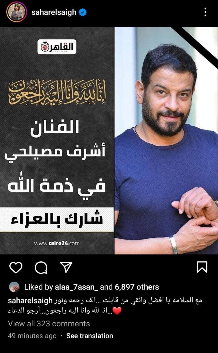 وبعد تعاونها مع في آخر أعماله مسلسل الطاووس، علقت الفنانة سهر الصايغ على خبر وفاة أشرف مصيلحي، من خلال حسابها الرسمي على انستجرام، وقالت: مع السلامة يا أفضل وأنقي من قابلت، ألف رحمه ونور، إنا لله وإنا إليه راجعون.. أرجو الدعاء.