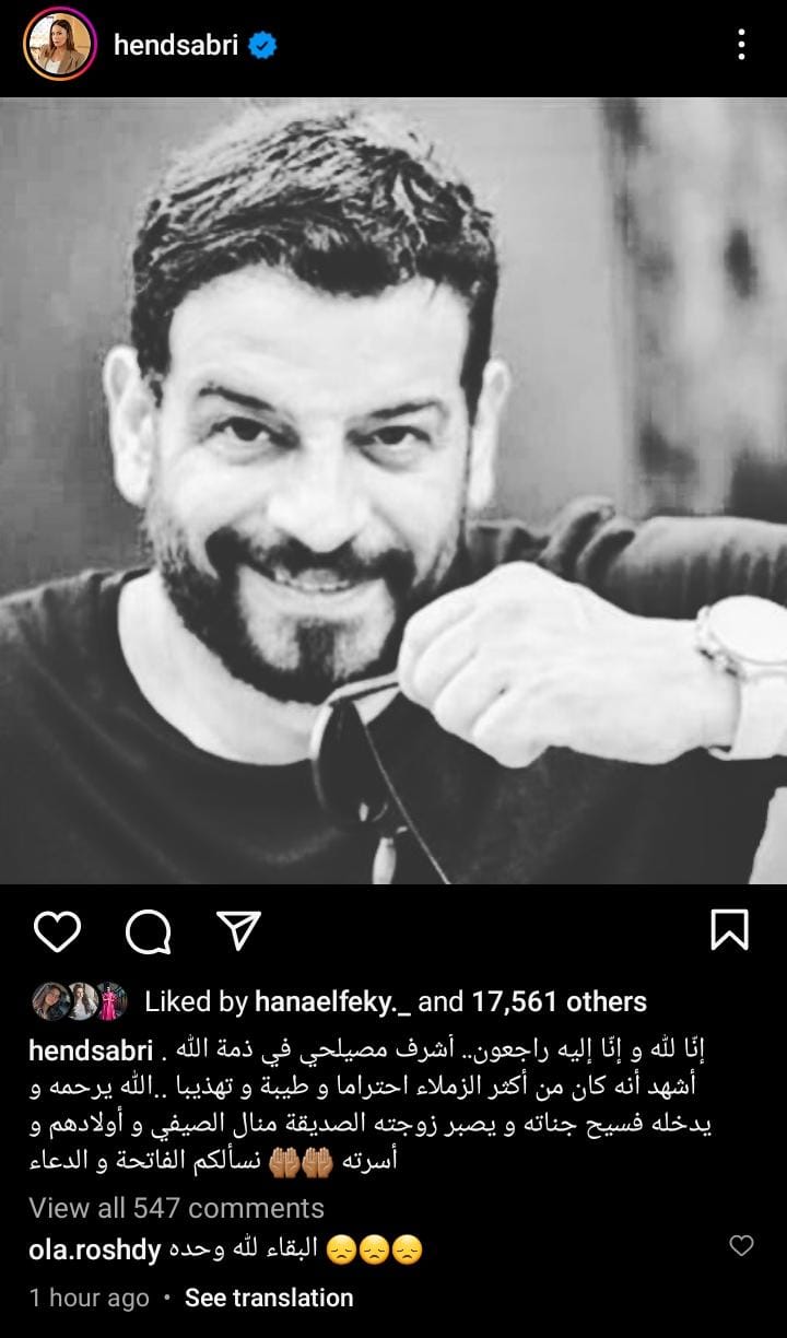 ونعت الفنانة هند صبري أشرف مصيلحي، وكتبت عبر حسابها بموقع انسترجام: إنا لله وإنا إليه راجعون، أشرف مصيلحي في ذمة الله، أشهد أنه كان من أكثر الزملاء احتراما وطيبة وتهذيبا، الله يرحمه ويدخله فسيح جناته ويصبر زوجته الصديقة منال الصيفي وأولادهم وأسرته.. نسألكم الفاتحة والدعاء.
