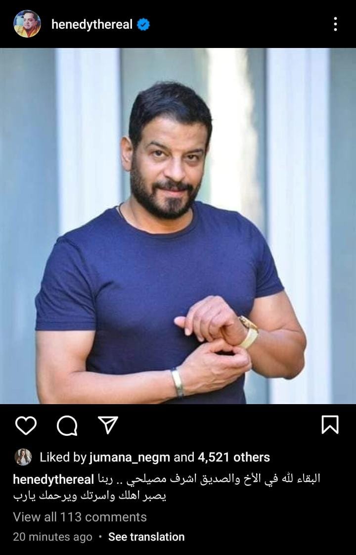 وحرص الفنان محمد هنيدي، على مواساة أهل الفقيد أشرف مصيلحي، داعيًا لهم بالصبر، وكتب عبر حسابه الرسمي بموقع انستجرام: البقاء لله في الأخ والصديق أشرف مصيلحي، ربنا يصبر أهلك وأسرتك ويرحمك يارب.