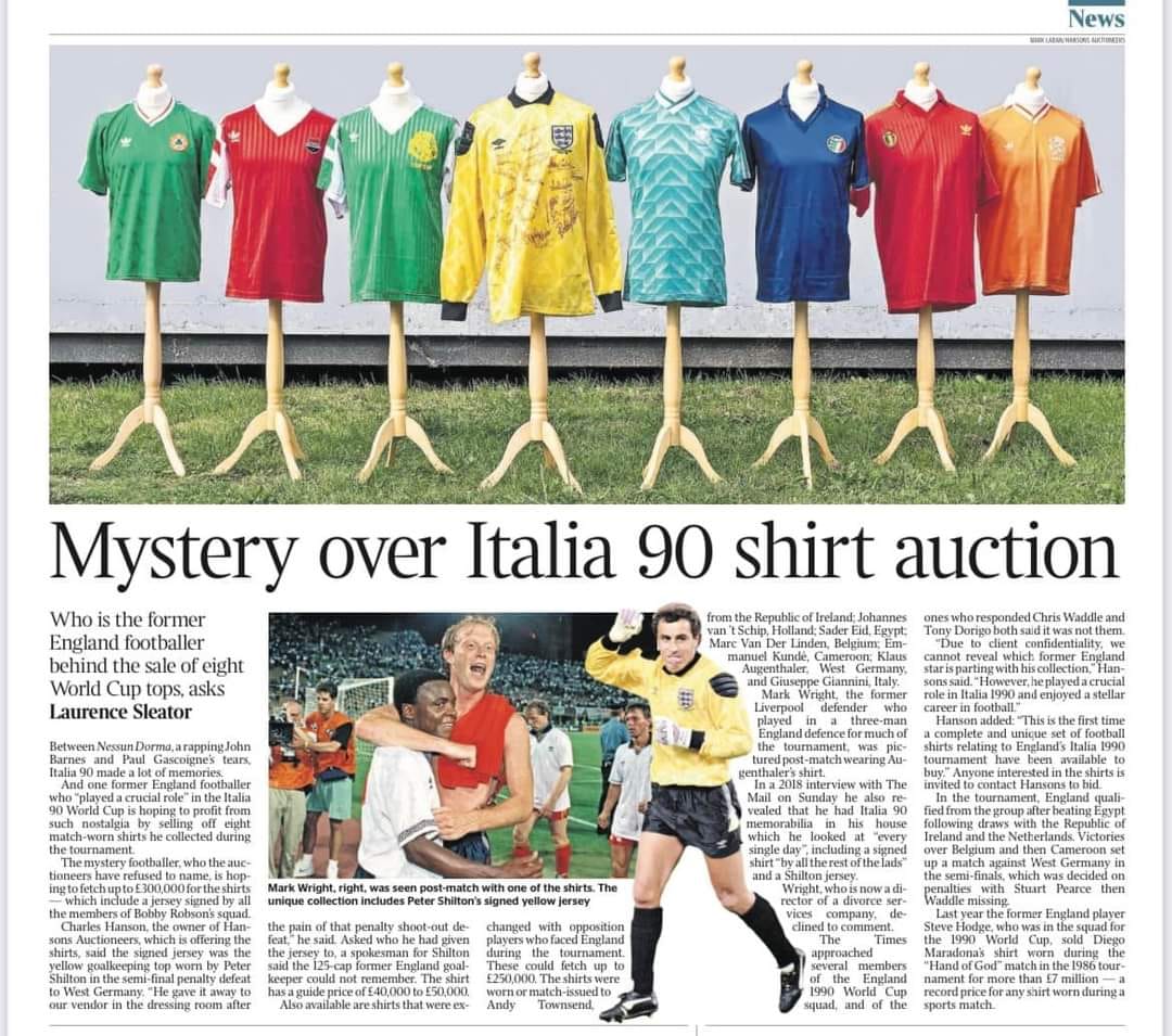 ولم يتم حتى الآن الكشف عن هوية اللاعب الذي عرض كل هذه القمصان للبيع، وتزعم الصحافة الإنجليزية أنه لعب دورًا حاسمًا بالبطولة التي أقيمت بإيطاليا عام 1990، مقابل هذا المبلغ الذي يعتبر بسيطًا، حتى وقد تم سؤال بيتر شيلتون عن زميله الذي منحه القميص أكد أنه لا يتذكر إطلاقًا.