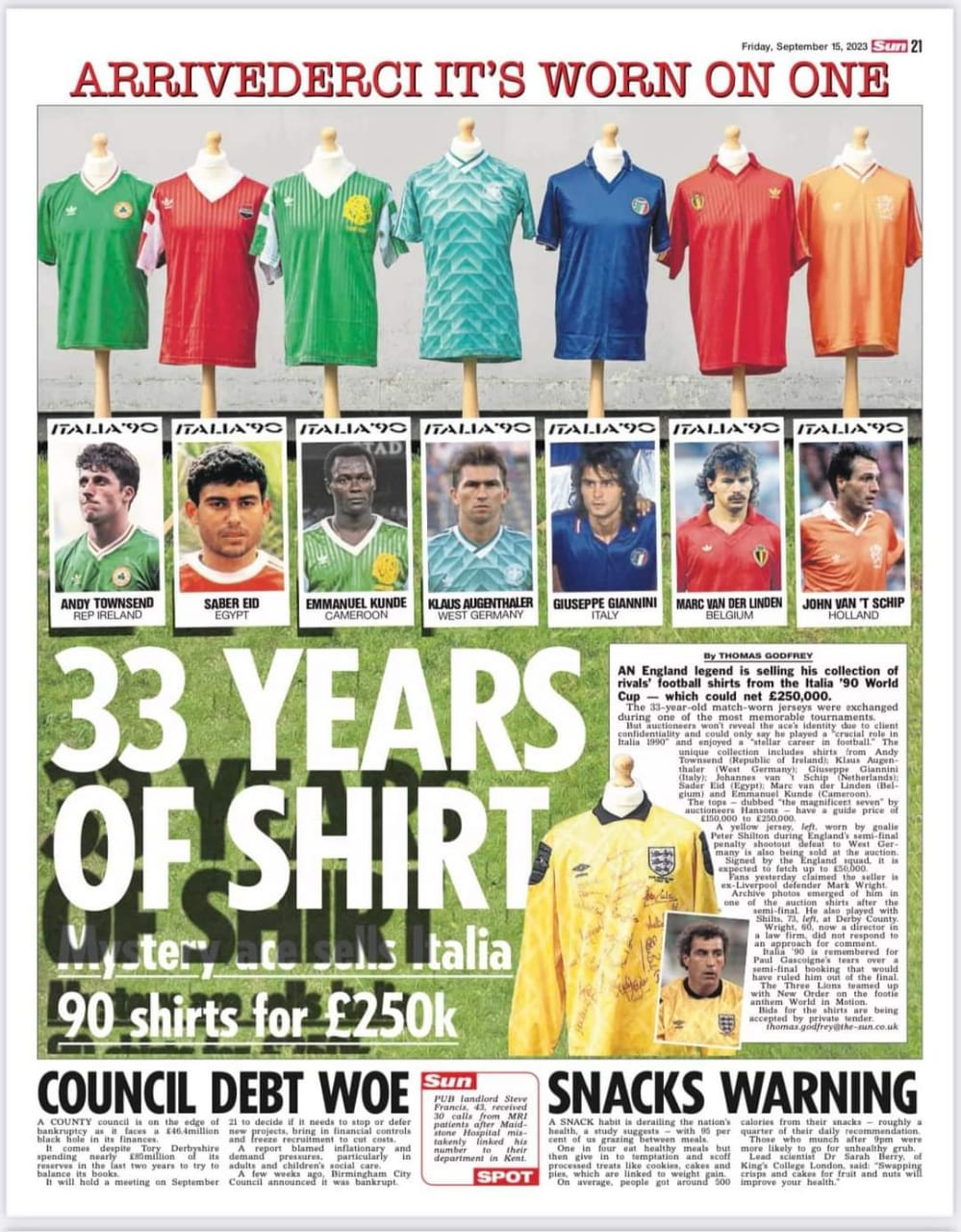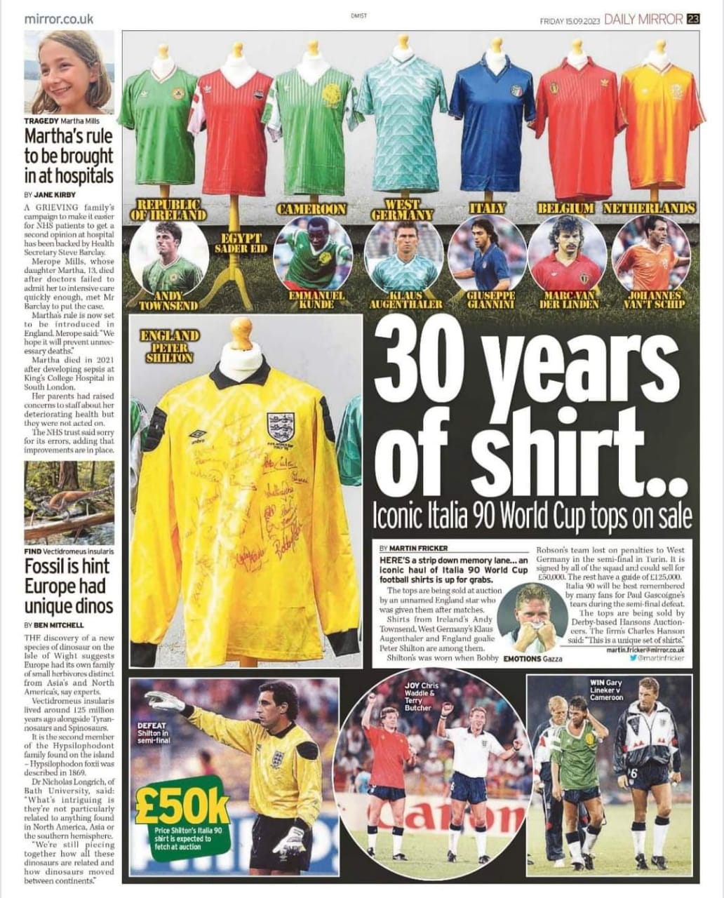 ونشرت الصحف الإنجليزية، وعلى رأسها “ذا صن وميرور وإكسبريس”، خبرا يتضمن تقديم لاعب من جيل كأس العالم 1990 بمنتخب إنجلترا رفض الكشف عن هويته 8 قمصان استبدلها مع المنتخبات التي واجهها في مشوار منتخب بلاده بهذه النسخة من المونديال لشركة مزادات من أجل عرضها للبيع مقابل 300 ألف جنيه إستيرليني.