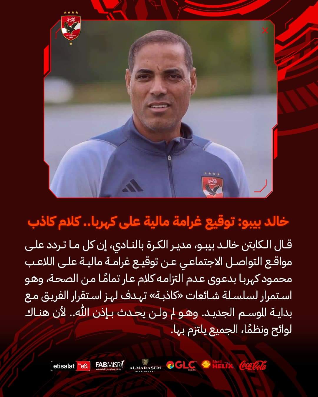 وفي وقت سابق، ذكر مصدر خاص داخل النادي الأهلي في تصريحات لموقع القاهرة 24، أن كل ما أثير حول توقيع غرامة مالية على كهربا عاري تماما عن الصحة وهو ما أكده خالد بيبو بشكل رسمي.
