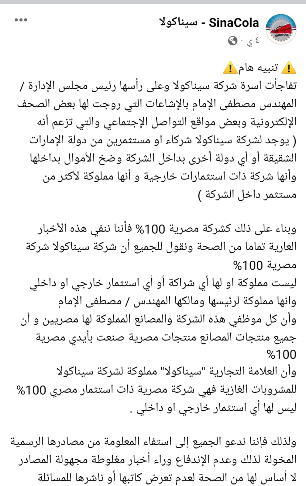 وبعد هذا الإعلان، قال بيان صادر عن مصطفى الإمام مؤسس سينا كولا، إن شركة سينا كولا وعلى رأسها رئيس مجلس الإدارة المهندس مصطفى الإمام تفاجأ بالإشاعات التي روجت لها بعض الصحف الإلكترونية، وبعض مواقع التواصل الاجتماعي، والتي تزعم أنه يوجد لشركة سينا كولا شركاء او مستثمرين من دولة الإمارات الشقيقة أو أي دولة أخرى بداخل الشركة وضخ الأموال بداخلها، وأنها شركة ذات استثمارات خارجية وأنها مملوكة لأكثر من مستثمر داخل الشركة.