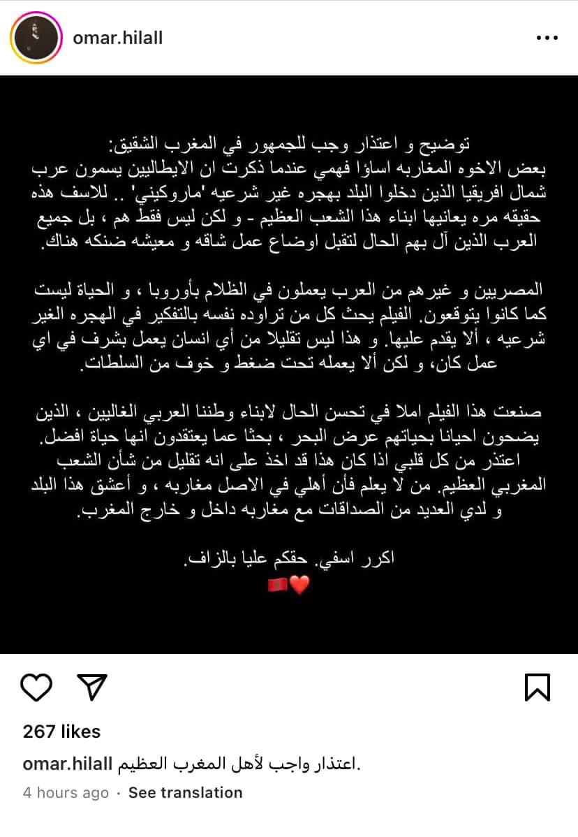 وقال عمر هلال عبر حسابه الشخصي بموقع إنستجرام: توضيح واعتذار وحب للجمهور في المغرب الشقيق، بعض الأخوة المغاربة أساؤوا فهمي عندما ذكرت أن الإيطاليين يسمون عرب شمال إفريقيا الذين دخلوا البلد بهجرة غیر شرعیة ماروكيني.. للأسف هذه حقيقة مُرة يعانيها أبناء هذا الشعب العظيم، ولكن ليس فقط هم، بل جميع العرب الذين آل بهم الحال لتقبل أوضاع عمل شاقة ومعیشة ضنكة هناك.