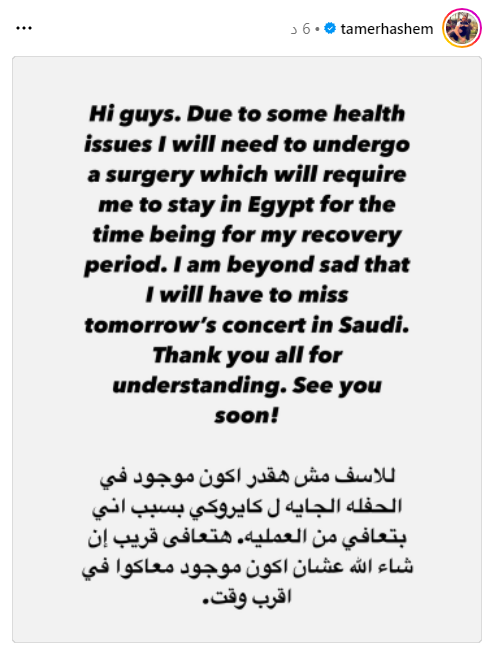وكتب تامر هاشم عبر حسابه على إنستجرام، التالي: للأسف مش هقدر أكون موجود في الحفلة الجاية لكايروكي بسبب إني بتعافى من العملية، هتعافى قريب إن شاء الله عشان أكون موجود معاكم في أقرب وقت.