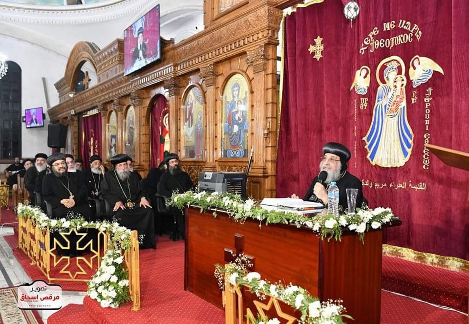 وأشاد قداسة البابا في مفتتح عظة الاجتماع بتاريخ كنيسة السيدة العذراء والقديس البابا كيرلس عمود الدين، شاكرًا آبائها وشعبها على محبتهم واهتمامهم بتطوير الكنيسة، مشيرًا إلى جهود القديس القمص بيشوي كامل في بناء الكنيسة.