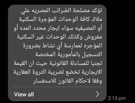 وطالبت الضرائب في رسائل نصية علي هواتف المواطنين، إن سرعة التسجيل يأتي تجنبا للمساءلة القانونية، مؤكدة أن القيمة الإيجارية تخضع لضريبة الثروة العقارية وفقا لأحكام القانون.