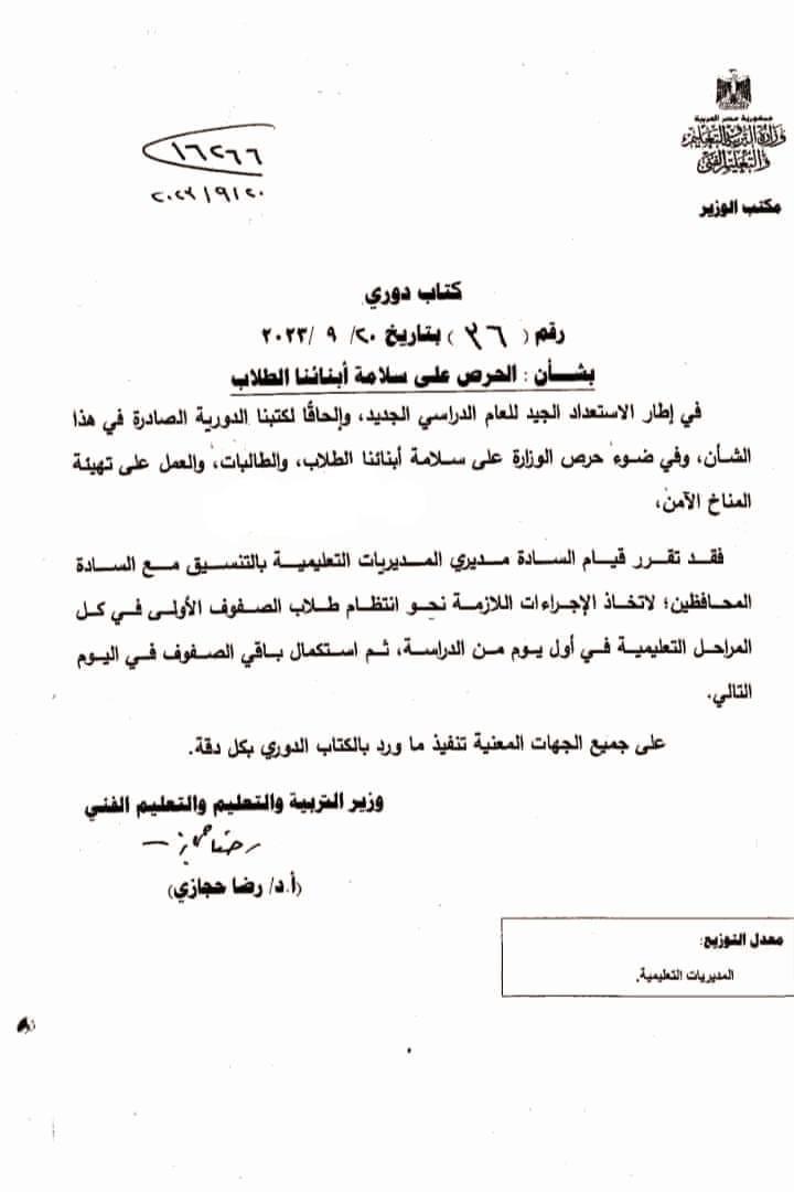 وقال الدكتور رضا حجازي، في الكتاب الدوري الصادر بتاريخ أمس 20 سبتمبر، والذي حمل رقم 36، إنه بشأن الحرص على سلامة أبنائنا الطلاب، وفي إطار الاستعداد الجيد للعام الدراسي الجديد، وإلحاقا لكتبنا الدورية الصادرة في هذا الشأن، وفي ضوء حرص الوزارة على سلامة أبنائنا الطلاب والطالبات، والعمل على تهيئة المناخ الآمن، فقد تقرر قيام السادة مديري المديريات التعليمية بالتنسيق مع السادة المحافظين؛ لاتخاذ الإجراءات اللازمة نحو انتظام طلاب الصفوف الأولى في كل المراحل التعليمية في أول يوم من الدراسة، ثم استكمال باقي الصفوف في اليوم التالي.