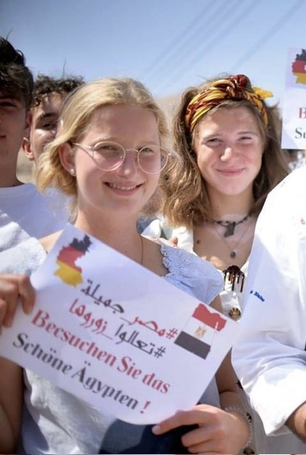 ورفعت الفتيات الألمانيات لافتات كتب عليها هشتاجات باللغتين العربية والألمانية، مكتوب عليها: مصر جميلة تعالوا زوروها، ورسموا على اللافتات علمي مصر وألمانيا.