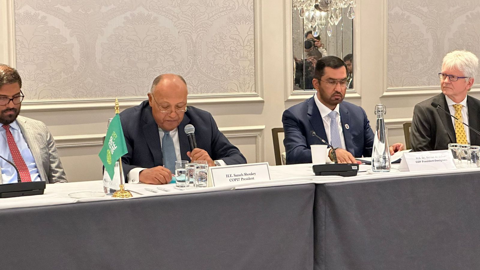 شارك سامح شكري وزير الخارجية، في الاجتماع الوزاري حول التقييم العالمي الأول تحت اتفاق باريس، وذلك على هامش اجتماعات الدورة الـ 78 للجمعية العامة للأمم المتحدة نيويورك، حيث ألقى كلمة بصفته رئيس الدورة 27 لمؤتمر الأمم المتحدة للمناخ COP27.