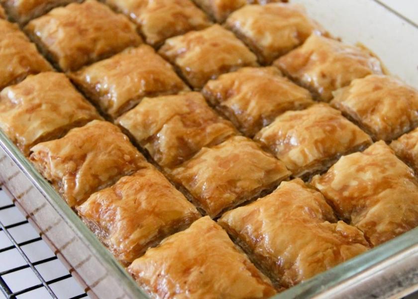 - وأخيرا بعدما يصبح لون الجلاش ذهبيا، يخرج من الفرن ويوضع الشربات البارد ويزين بالمكسرات المجروشة وبألف هنا وشفا.