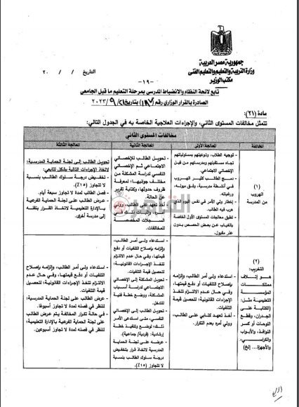 وأوضحت اللائحة، أن المعالجة الثالثة تتضمن تحويل الطالب إلى لجنة الحماية المدرسية، وتخفيض درجة سلوك الطالب بنسبة لا تتجاوز 15%، فضلًا عن فصل الطالب لمدة لا تجاوز 7 أيام، وعرض الطالب على لجنة الحماية الفرعي بالإدارة التعليمية لاتخاذ القرار بنقله إلى مدرسة أخرى.