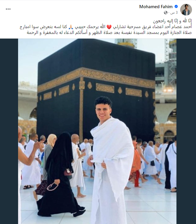 وكتب محمد فهيم عبر حسابه على فيسبوك، الآتي: إنا لله وإنا إليه راجعون.. أحمد عصام أحد أعضاء فريق مسرحية تشارلي.. الله يرحمك حبيبي.. كنا لسه بنعرض سوا امبارح.. صلاة الجنازة اليوم بمسجد السيدة نفيسة بعد صلاة الظهر وأسألكم الدعاء له بالمغفرة والرحمة.
