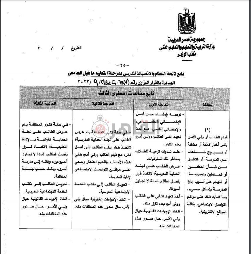 كما أكدت الوزارة، على عقد ندوات توعية للطلاب، وعرض الطالب على لجنة الحماية المدرسية لاتخاذ قرار بفصل الطالب لمدة لا تجاوز أسبوعا، مع أخذ تعهد كتابي على الطالب وولي أمره بعدم تكرار ذلك، فضلًا عن اتخاذ الإجراءات القانونية حيال ولي الأمر، حال صدور هذه المخالفات منه.