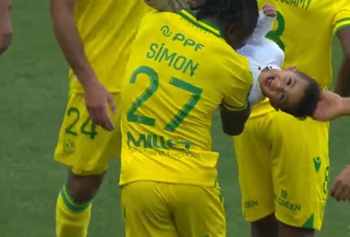 وحمل النيجيري موسيس سيمون مهاجم نانت، عُدي مصطفى محمد بعد نهاية مباراة نانت أمس أمام لوريان للاحتفال واللعب معه، في وصلة هزار مميزة أثارت إعجاب رواد مواقع التواصل الاجتماعي.