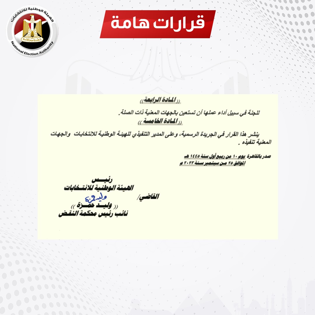 وقالت الهيئة الوطنية للانتخابات في بيان: بعد الاطلاع على الدستور؛ وعلى القانون رقم 22 لسنة 2014بتنظيم الانتخابات الرئاسية وتعديلاته؛ وعلى القانون رقم45 لسنة 2014 بتنظيم مباشرة الحقوق السياسية وتعديلاته، وعلى القانون رقم198 لسنة2017 في شأن الهيئة الوطنية للانتخابات وتعديلاته؛ وعلى قرار الهيئة الوطنية للانتخابات رقم 3 لسنة2023 بدعوة الناخبين لأنتخاب رئيس الجمهورية، بتشكل لجنة برئاسة مدير الجهاز التنفيذي للهيئة.الوطنية للانتخابات وعضوية نواب مدير الجهاز وأعضائه.