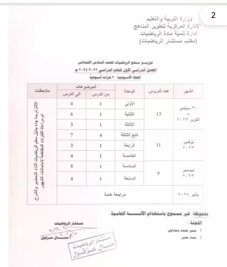 ننشر توزيع منهج الرياضيات للصف السادس الابتدائي 2024