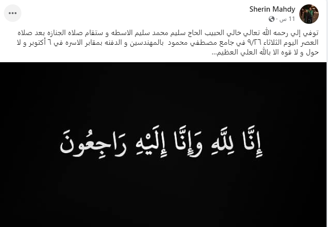 وأعلن شيرين مهدي، نجل الفنانة كريمان، وفاة خاله، وذلك عبر حسابه الشخصي بموقع التواصل الاجتماعي فيسبوك، قال فيه: توفي إلى رحمة الله تعالى، خالي الحبيب الحاج سليم محمد سليم الأسطة، وستقام صلاة الجنازة بعد صلاة العصر اليوم الثلاثاء، في جامع مصطفى محمود بالمهندسين، والدفنة بمقابر الأسرة في 6 أكتوبر ولا حول ولا قوة، إلا بالله العلي العظيم.